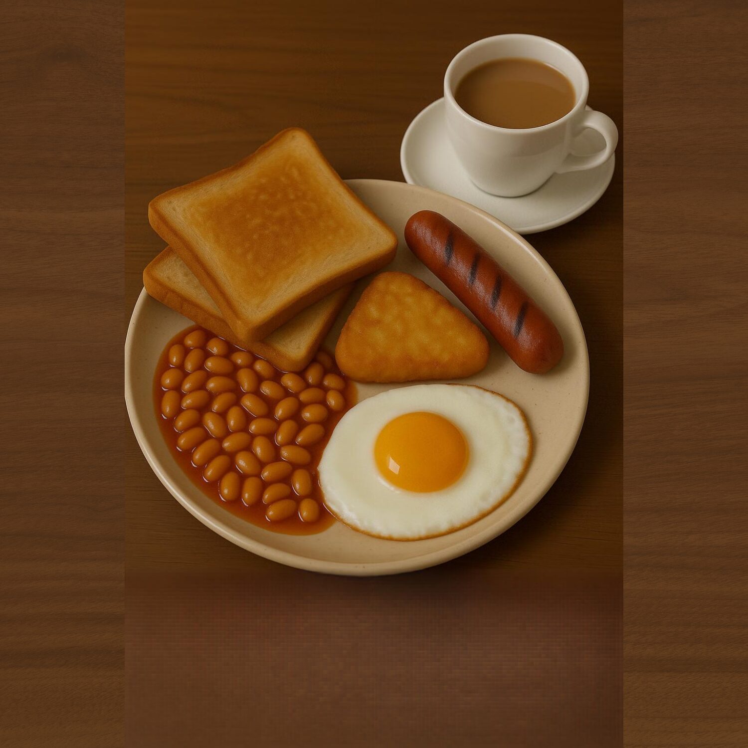 2 Hash brown, 2 Halal Sausage, 4 Slices of Toast, beans, Tomato, Mushroom, and an egg